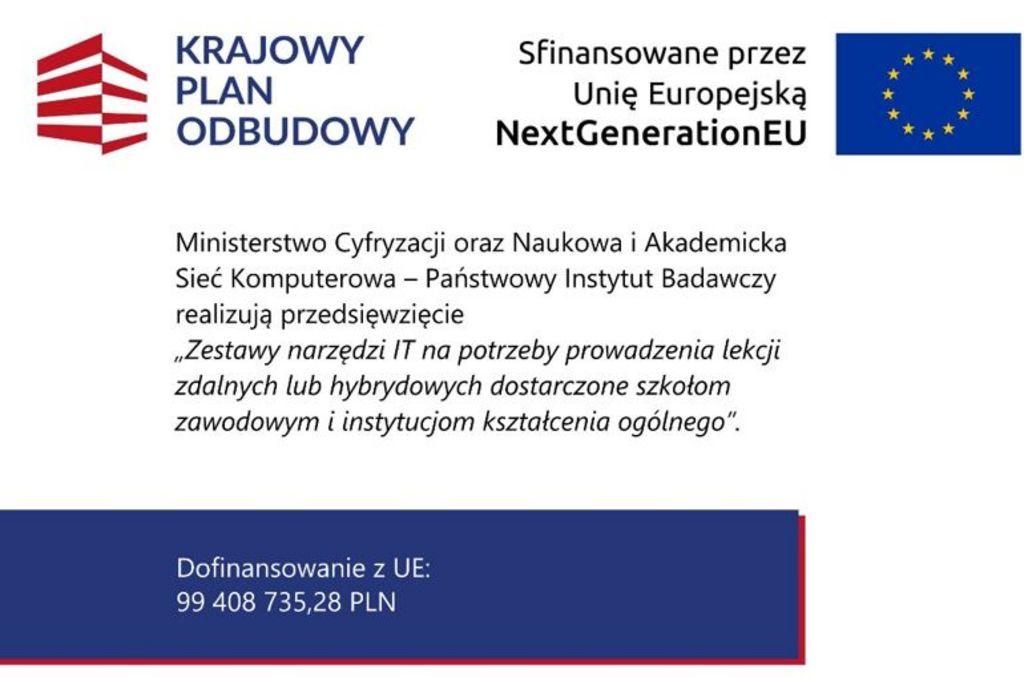 Ministerstwo Cyfryzacji we współpracy z Ministerstwem Edukacji Narodowej, realizuje zadanie w ramach Krajowego Planu Odbudowy i Zwiększania Odporności (KPO) pn. „Wdrażanie inwestycji C2.1.2 Wyposażenie szkół/instytucji w odpowiednie urządzenia i infrastrukturę ICT w celu poprawy ogólnej wydajności systemów edukacji, wskaźnik C12L Zestawy narzędzi informatycznych na potrzeby prowadzenia lekcji zdalnych lub hybrydowych dostarczone szkołom zawodowym i instytucjom kształcenia ogólnego”.