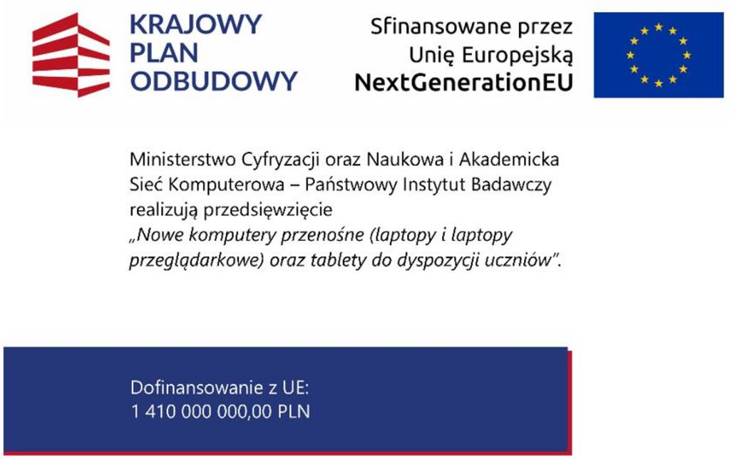 Ministerstwo Cyfryzacji we współpracy z Ministerstwem Edukacji Narodowej, realizuje zadanie w ramach Krajowego Planu Odbudowy i Zwiększania Odporności (KPO) pn. „Wdrażanie inwestycji C2.1.2 Wyrównanie poziomu wyposażenia szkół w przenośne urządzenia multimedialne - inwestycje związane ze spełnieniem minimalnych standardów sprzętowych, wskaźnik C15G „Nowe komputery przenośne (laptopy, laptopy przeglądarkowe i tablety) do dyspozycji uczniów”.