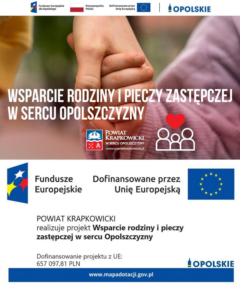 RUSZA REKRUTACJA DO BEZPŁATNEGO UDZIAŁU W SZKOLENIU DLA OSÓB SPRAWUJĄCYCH RODZINNĄ PIECZĘ ZASTĘPCZĄ Z POWIATU KRAPKOWICKIEGO W RAMACH PROJEKTU „WSPARCIE RODZINY I PIECZY ZASTĘPCZEJ W SERCU OPOLSZCZYZNY”, realizowanego w ramach Programu Fundusze Europejskie dla Opolskiego na lata 2021-2027, współfinansowanego ze środków Europejskiego Funduszu Społecznego Plus w ramach Priorytetu 6 Fundusze Europejskie wspierające włączenie społeczne w opolskim, działania 6.7 Wsparcie rodziny i pieczy zastępczej.