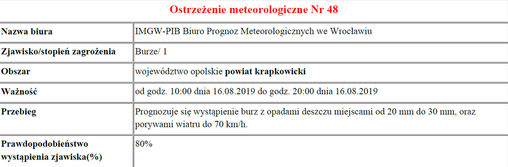 Data i godzina wydania: 07.08.2019 - godz. 13:04 Nazwa biura prognoz hydrologicznych: BPH IMGW-PIB Wrocław Obszar Wrocław INFORMACJA O NIEBEZPIECZNYM ZJAWISKU Nr I:40 Zjawisko: wezbranie z przekroczeniem stanów ostrzegawczych Stopień zagrożenia: 2 Ważność: od godz. 15:00 dnia 07.08.2019 do godz. 09:00 dnia 08.08.2019 Obszar: Dopływy Odry (opolskie) Przebieg: W rejonach wystąpienia intensywnych opadów, zwłaszcza w Sudetach, możliwe są gwałtowne wzrosty stanów wody i przekroczenie stanów...