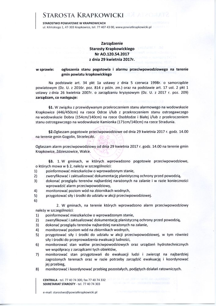 Po posiedzeniu Powiatowego Zespołu Zarządzania Kryzysowego z uwagi na prognozy Biura Prognoz Hydrologicznych IMGW i przewidywane na 1 maja przejście fali powodującej przekroczenie stanu alarmowego na Odrze w Krapkowicach nawet o ponad metr, dziś (29 kwietnia) o godzinie 14:00 na terenie trzech gmin - Krapkowice, Zdzieszowice i Walce wprowadziłem alarm powodziowy. Na terenie gminy Strzeleczki i Gogolin obowiązuje natomiast pogotowie przeciwpowodziowe. Służby rozpoczęły działania zgodne z procedurami.