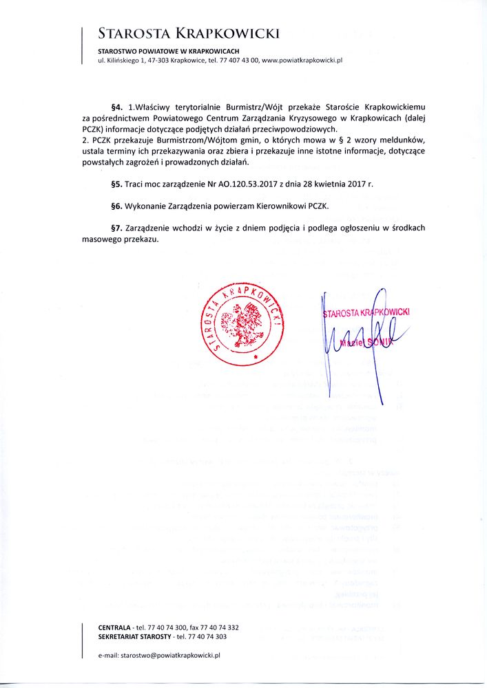 Kontakt 24h pod nr tel. 77 40 74 333 i 663 736 399 lub e-mail pczk@powiatkrapkowicki.pl.