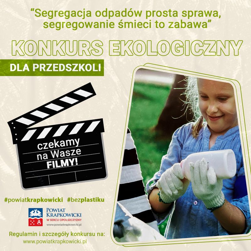 Zachęcamy wszystkie przedszkola z terenu powiatu krapkowickiego do nakręcenia krótkich filmów przedstawiających i promujących ekologiczne zachowania, a przede wszystkim selekcję odpadów. Na materiały czekamy do 3 grudnia. Dla najlepszych przewidziano nagrody o łącznej wartości 10 tysięcy złotych! Podczas oceniania pod uwagę brana będzie spójność filmu z tematem konkursu, walory edukacyjne i wychowawcze filmu oraz pomysłowość, oryginalność i atrakcyjność filmu. Szczegóły i regulamin na stronie powiatu krapkowickiego. W przypadku pytań technicznych prosimy o kontakt pod numerem telefonu 77 40 74 312.