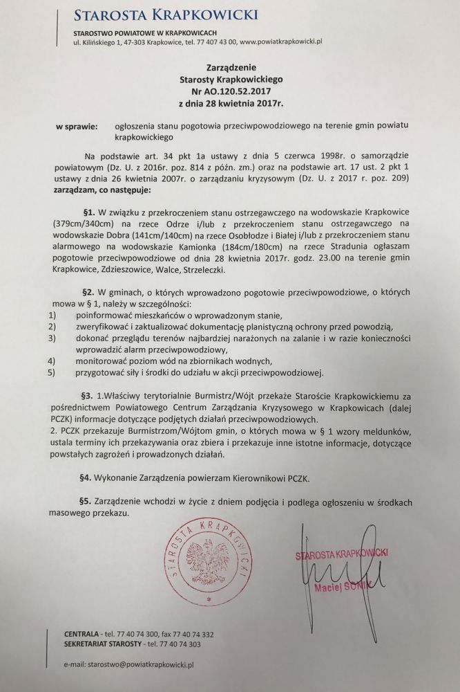 Starosta Krapkowicki Maciej Sonik zwołał na dziś na godzinę 12.00 posiedzenie Powiatowego Zespołu Zarządzania Kryzysowego w celu przeanalizowania aktualnego zagrożenia powodziowego na terenie powiatu krapkowickiego.