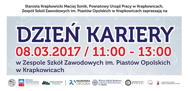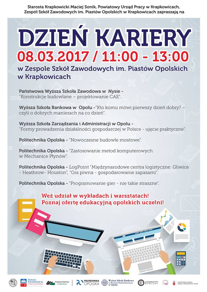Kariera to w prostym tłumaczeniu droga profesjonalnego rozwoju, którą człowiek ma zamiar przejść w swym zawodowym życiu. Rozumienie tego pojęcia jest zawsze bardzo subiektywne, co nie jest błędem, gdyż każdy ma prawo do innego spojrzenia na karierę ponieważ każdy chciałby co innego w swym życiu zawodowym osiągnąć. Jedno jest jednak pewne - każdy krok należy dokładnie przemyśleć, bo najmniejszy detal może rzutować na naszą przyszłość. Stąd też pomysł na organizacje Dnia Kariery, na który zapraszają Starosta Krapkowicki i Zespół Szkół im. Piastów Opolskich. Jego celem jest przybliżenie oferty edukacyjnej opolskich uczelni i ułatwienie tym samy podjęcia istotnej decyzji. Już w najbliższą środę między godziną 11:00-13:00 w krapkowicki zamku będzie można zapoznać się z ofertą Państwowej Wyższej Szkoły Zawodowej w Nysie, Wyższej Szkoły Bankowej w Opolu, Wyższej Szkoły Zarządzania i Administracji w Opolu oraz Politechniki Opolskiej. W programie wykłady i warsztaty takie jak - „Konstrukcje budowlane - projektowanie CAE", „Kto komu mówi dzień dobry? - czyli o dobrych manierach na co dzień”, „Formy prowadzenia działalności gospodarczej w Polsce - ujęcie praktyczne”, czy „Programowanie gier- nie takie straszne”. Szczegóły na plakacie