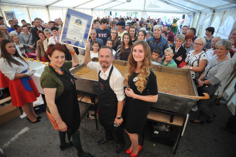 Gigantyczna dynia nie była jednak jedynym rekordem ustanowionym podczas poprzedniej edycji imprezy. W powiecie krapkowickim ugotowano też 530 litrów zupy z pomarańczowego warzywa. Tym razem kucharze podjęli się jeszcze trudniejszego zadania. Postanowili przygotować ogromną porcję dżemu. Najtrudniejsze było przygotowanie składników. Pokroić 200 kilogramowe okazy w kosteczkę to nie lada wyzwanie. Podjęli się go pracownicy starostwa, którzy w sobotnie przedpołudnie przy użyciu noży i piły kroili dynie. W efekcie ich pracy, ale także doskonałego przepisu Związku Sląskich Kobiet Wiejskich i mistrzowskiego wyczucia smaku przez pracujących przy nim kucharzy udało się ustanowić nowy Rekord Polski. Potwierdzający to certyfikat odebrali starosta krapkowicki Maciej Sonik oraz wicestarosta Sabina Gorzkulla, którzy chwile później podwinęli rękawy i zaczęli rozdawać dżem mieszkańcom. Napełniono 2000 przygotowanych specjalnie na tę okazję słoiczków. Dzięki temu każdy, kto chciał, a chętnych było sporo mógł zabrać dżem do domu.