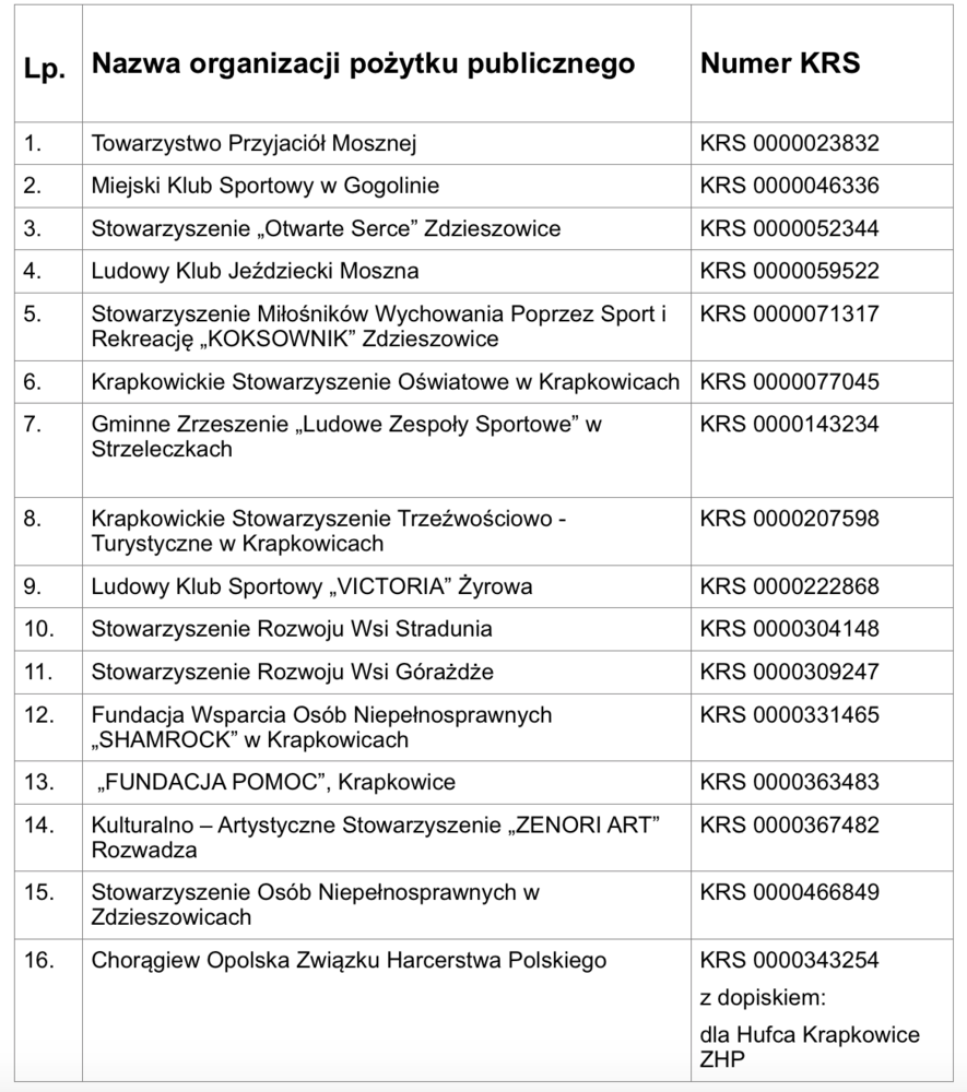Działalności lokalnych organizacji pozarządowych jest zróżnicowana i dotyka wielu płaszczyzn, dzięki czemu znajdziemy wśród nich z pewnością taki profil, który chcemy wspierać. Pieniądze przekazać można fundacjom i stowarzyszeniom działającym na rzecz rozwoju aktywności fizycznej, osób niepełnosprawnych, przewlekle chorych, czy np. harcerstwa. W zamieszczonej tabeli znajdują się dane organizacji z powiatu krapkowickiego, które zgodnie z wykazem posiadają status pożytku publicznego, dzięki czemu są uprawnione do 1% podatku za 2016 rok.