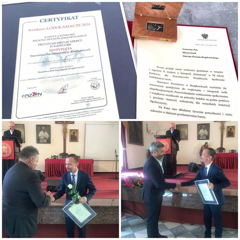 Nagroda „Lodołamacza” - przyznawana co roku pracodawcom, instytucjom i organizacjom tworzącym odpowiednie warunki dla osób niepełnosprawnych - trafiła w tym roku do krapkowickiego starostwa za drugie miejsce w kategorii Instytucja! Laureatami tegorocznego konkursu zostali również m.in. Biskup Świdnicki Ignacy Dec i Politechnika Wrocławska.