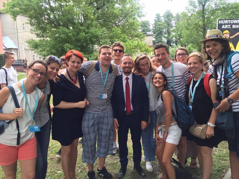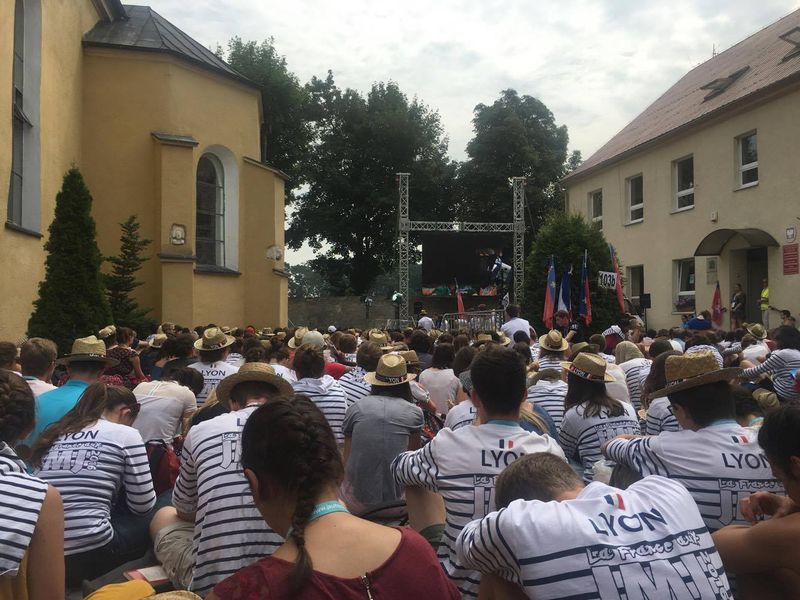 Kilka tysięcy osób wzięło udział w mszy świętej, odprawionej przez Prymasa Francji Phillipe Barbarin i Biskupa Opolskiego Andrzeja Czaję w kościele św. Mikołaja w Krapkowicach. Liturgię „na żywo” transmitował program drugi francuskiej telewizji. Samych gości z Lyonu było przeszło tysiąc dwustu. Dopisali też mieszkańcy. Wiele osób przebieg mszy z uwagi na brak miejsc w kościele, śledziło na telebimach. Po przeżyciu duchowym, pełni entuzjazmu młodzi ludzie zaczęli śpiewać pieśni religijne przed kościołem. Taki sposób modlitwy towarzyszył im w drodze do zamku, gdzie przygotowano z myślą o nich warsztaty rękodzieła i kiermasz. Młodzi ludzie byli pod wielkim wrażeniem rękodzielniczych zdolności naszych mieszkańców. Na licznie przygotowanych stanowiskach można było zobaczyć kojarzone z regionem kroszonki, ale też ręcznie wykonywaną biżuterię, czy torebki. Sporym zainteresowaniem cieszył się kołocz. Pielgrzymi z Francji przyznawali, że to ciasto bardzo im smakowało i chętnie zabraliby je do domu na spróbowanie swoim bliskim. Mieli tez okazję zatańczyć Zumbę pod okiem instruktorek Synergii Fitness. Zabawa była przednia.