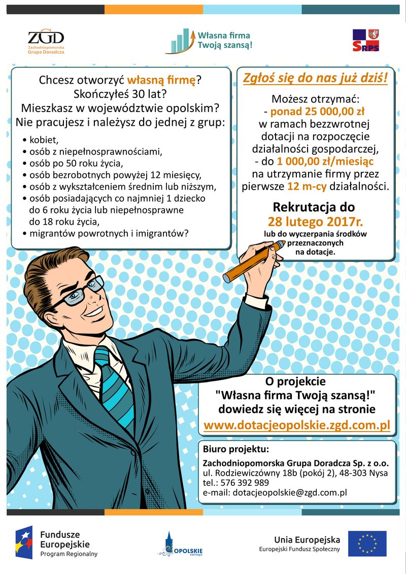 Projekt „Własne firma Twoją szansą!”, realizowany przez Zachodniopomorską Grupę Doradczą Sp. z o. o. w partnerstwie ze Stowarzyszeniem na Rzecz Rozwoju Powiatu Sławieńskiego, jest współfinansowany ze środków Unii Europejskiej w ramach Regionalnego Programu Operacyjnego Województwa Opolskiego na lata 2014 - 2020, Oś Priorytetowa VII „Konkurencyjny rynek pracy”, Działanie 7.3. „Zakładanie działalności gospodarczej”.