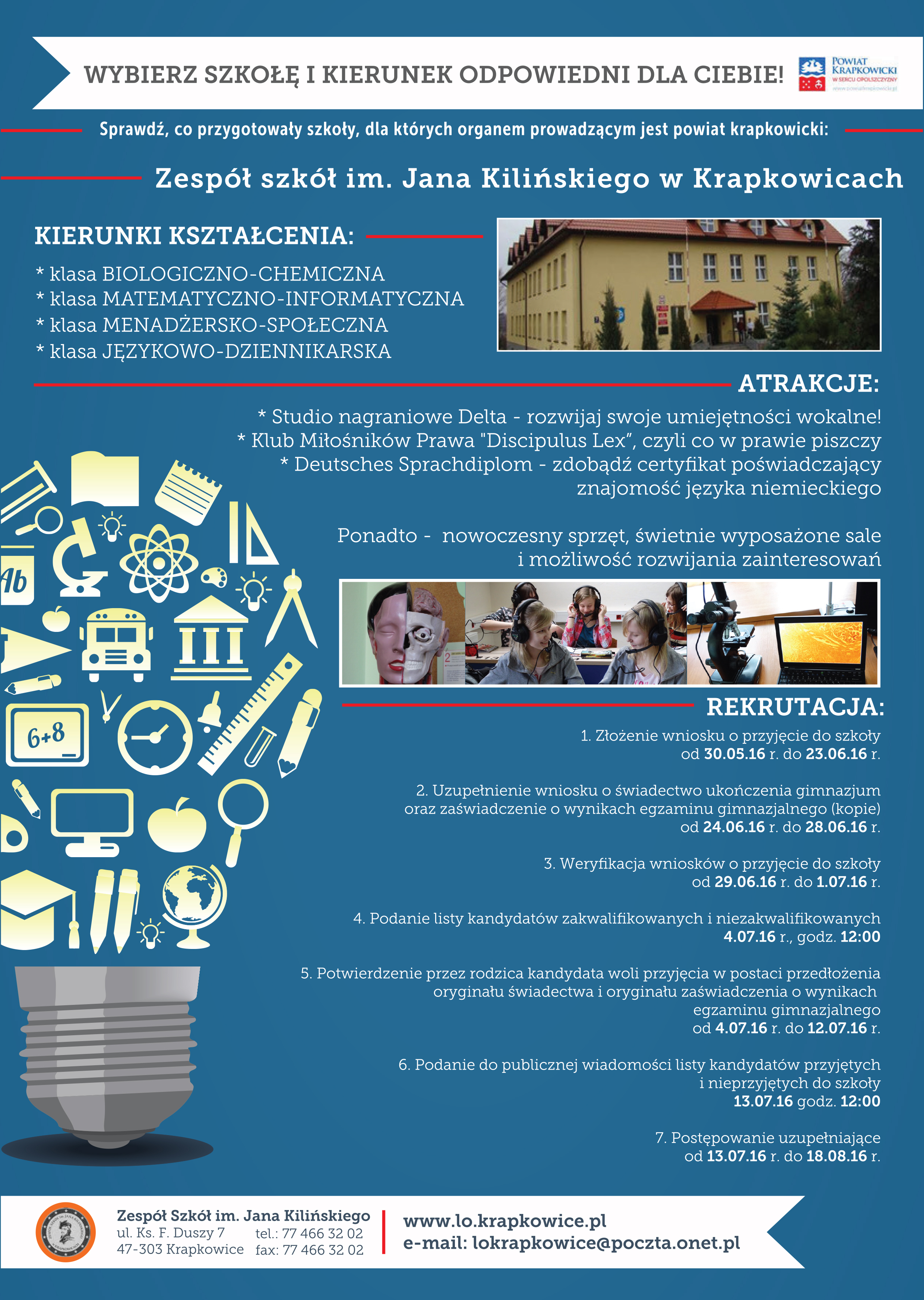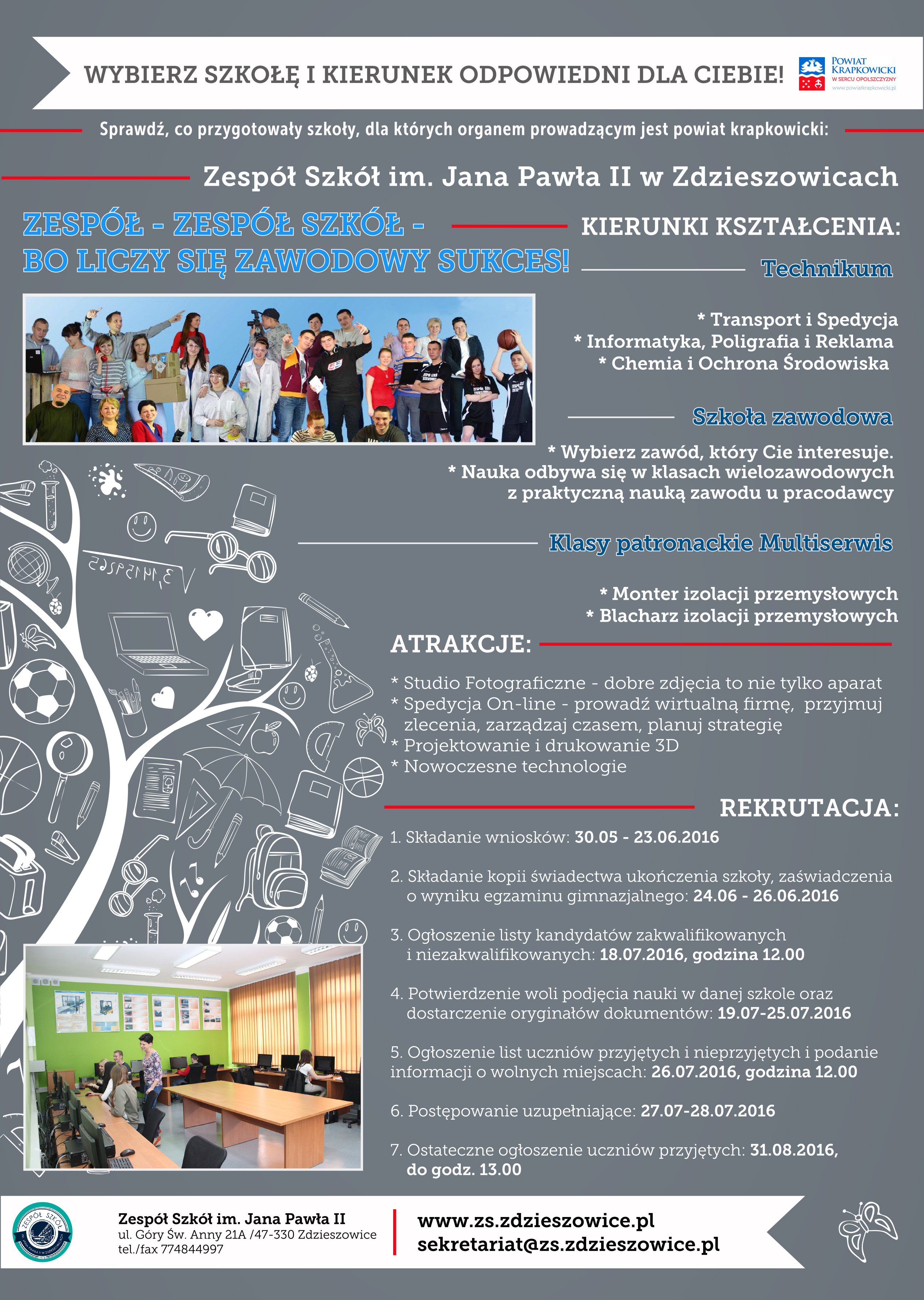 Kończycie gimnazjum i nie podjęliście jeszcze decyzji dotyczącej dalszego kształcenia? Koniecznie zapoznajcie się z ofertami szkół, dla których organem prowadzącym jest powiat krapkowicki. Na plakatach-przewodnikach, możecie znaleźć informacje na temat kierunków, zajęć dodatkowych i terminów rekrutacji. Chcecie wiedzieć więcej? Odwiedźcie strony internetowe, albo po prostu wybierzcie się do naszych placówek.Zespół Szkół im. Jana Pawła II w Zdzieszowicach Zespół Szkół Zawodowych im.Piastów Opolskich w Krapkowicach Liceum Ogólnokształcące im. Jana Kilińskiego w Krapkowicach czekają na Was!