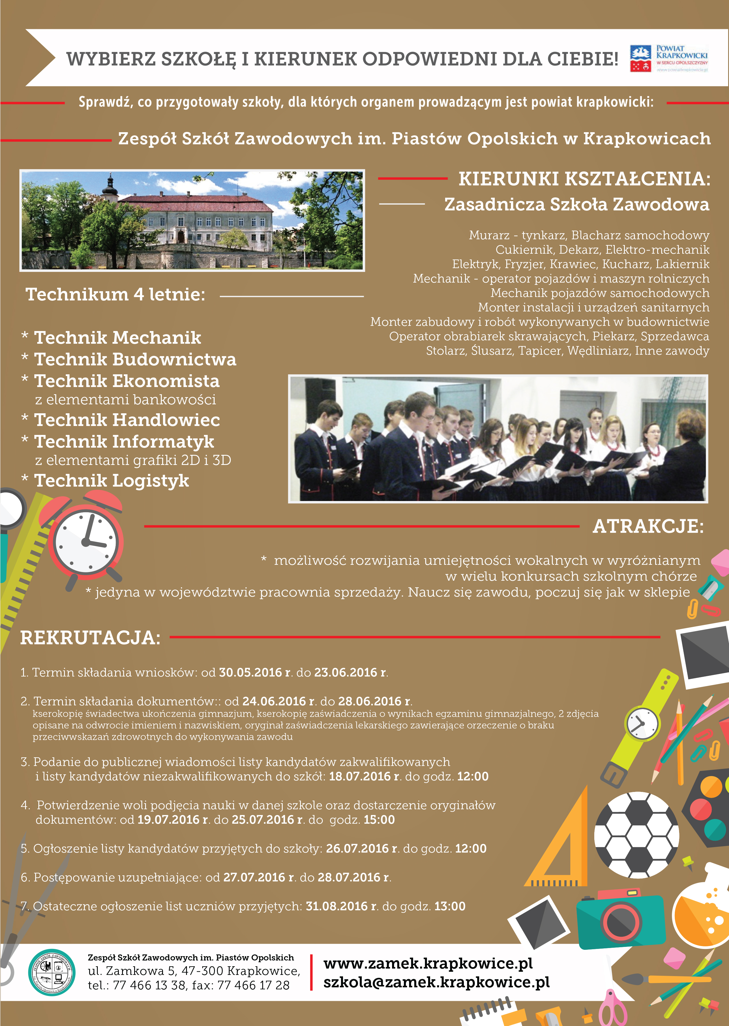 Kończycie gimnazjum i nie podjęliście jeszcze decyzji dotyczącej dalszego kształcenia? Koniecznie zapoznajcie się z ofertami szkół, dla których organem prowadzącym jest powiat krapkowicki. Na plakatach-przewodnikach, możecie znaleźć informacje na temat kierunków, zajęć dodatkowych i terminów rekrutacji. Chcecie wiedzieć więcej? Odwiedźcie strony internetowe, albo po prostu wybierzcie się do naszych placówek.Zespół Szkół im. Jana Pawła II w Zdzieszowicach Zespół Szkół Zawodowych im.Piastów Opolskich w Krapkowicach Liceum Ogólnokształcące im. Jana Kilińskiego w Krapkowicach czekają na Was!