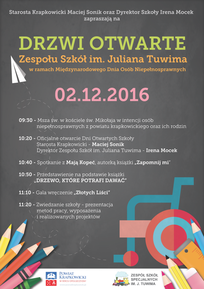 Spotkanie z Mają Kopeć, przedstawienie „Drzewo, które potrafi dawać” i gala wręczenia „Złotych Liści”, to plan Drzwi Otwartych w Zespole Szkół im. Juliana Tuwima w Krapkowicach organizowanych w ramach Międzynarodowego Dnia Osób Niepełnosprawnych. Wydarzenie zaplanowano na najbliższy piątek 2 grudnia.