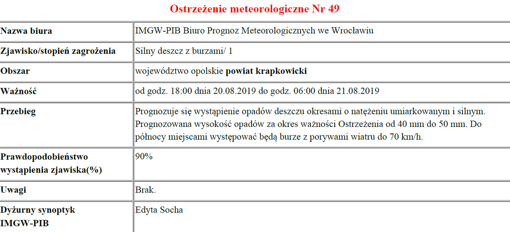 Data i godzina wydania: 07.08.2019 - godz. 13:04 Nazwa biura prognoz hydrologicznych: BPH IMGW-PIB Wrocław Obszar Wrocław INFORMACJA O NIEBEZPIECZNYM ZJAWISKU Nr I:40 Zjawisko: wezbranie z przekroczeniem stanów ostrzegawczych Stopień zagrożenia: 2 Ważność: od godz. 15:00 dnia 07.08.2019 do godz. 09:00 dnia 08.08.2019 Obszar: Dopływy Odry (opolskie) Przebieg: W rejonach wystąpienia intensywnych opadów, zwłaszcza w Sudetach, możliwe są gwałtowne wzrosty stanów wody i przekroczenie stanów...