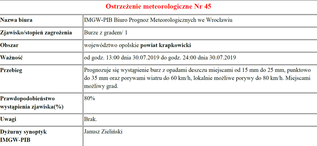Ostrzeżenie meteorologiczne nr 45 Burze z gradem /1