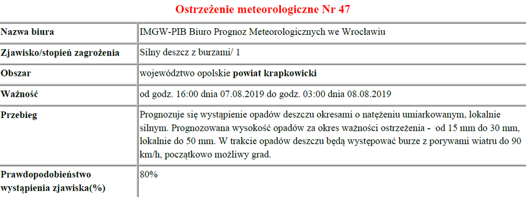 Ostrzeżenie meteorologiczne nr 47 - Silny deszcz z burzami 1